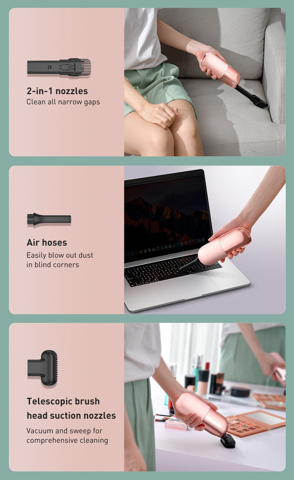 Hard to Reach Places: The mini vacuum cleaner is perfect for those hard to reach places. I.e. behind the cot, the lounge, and sliding doors